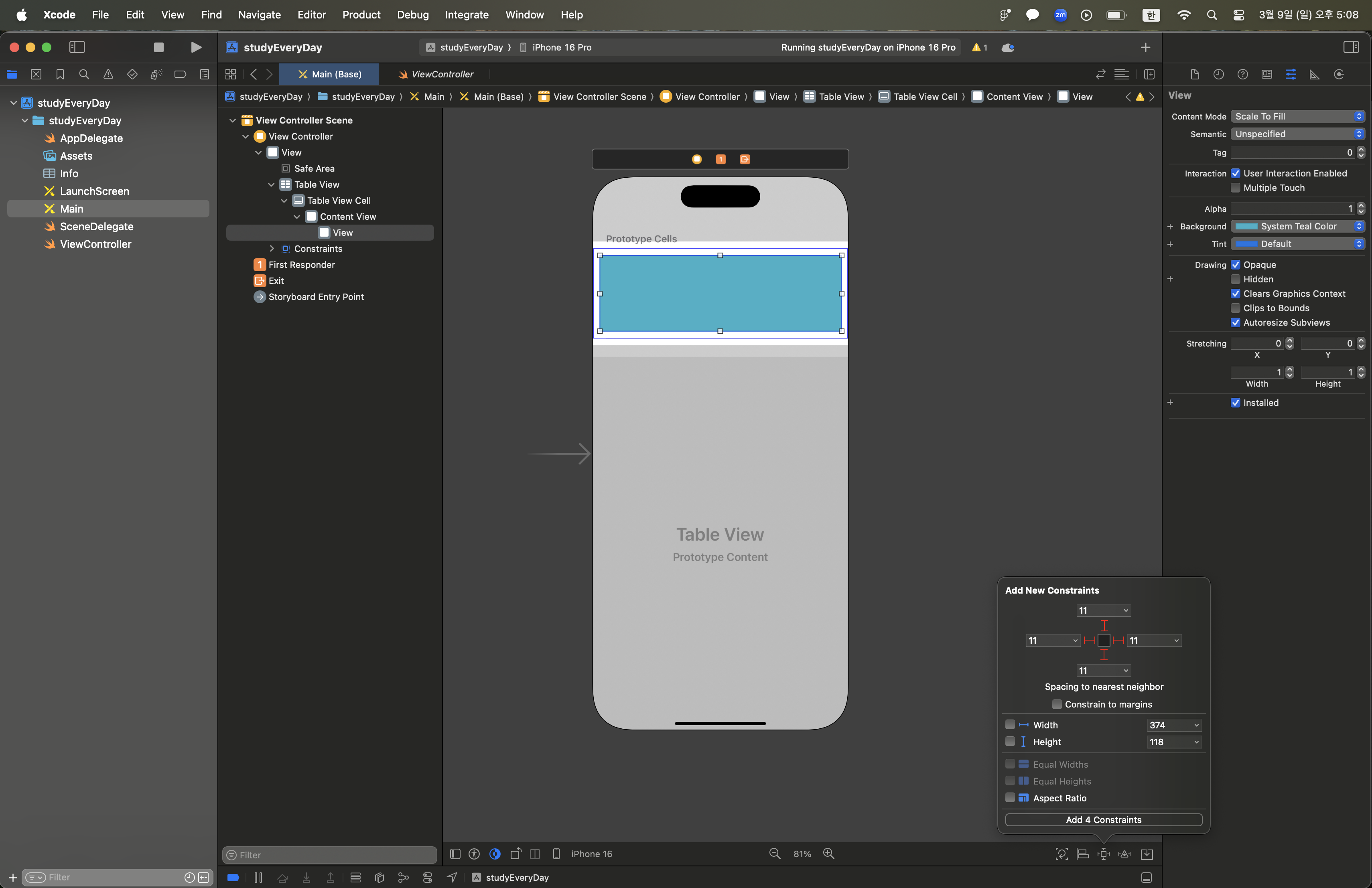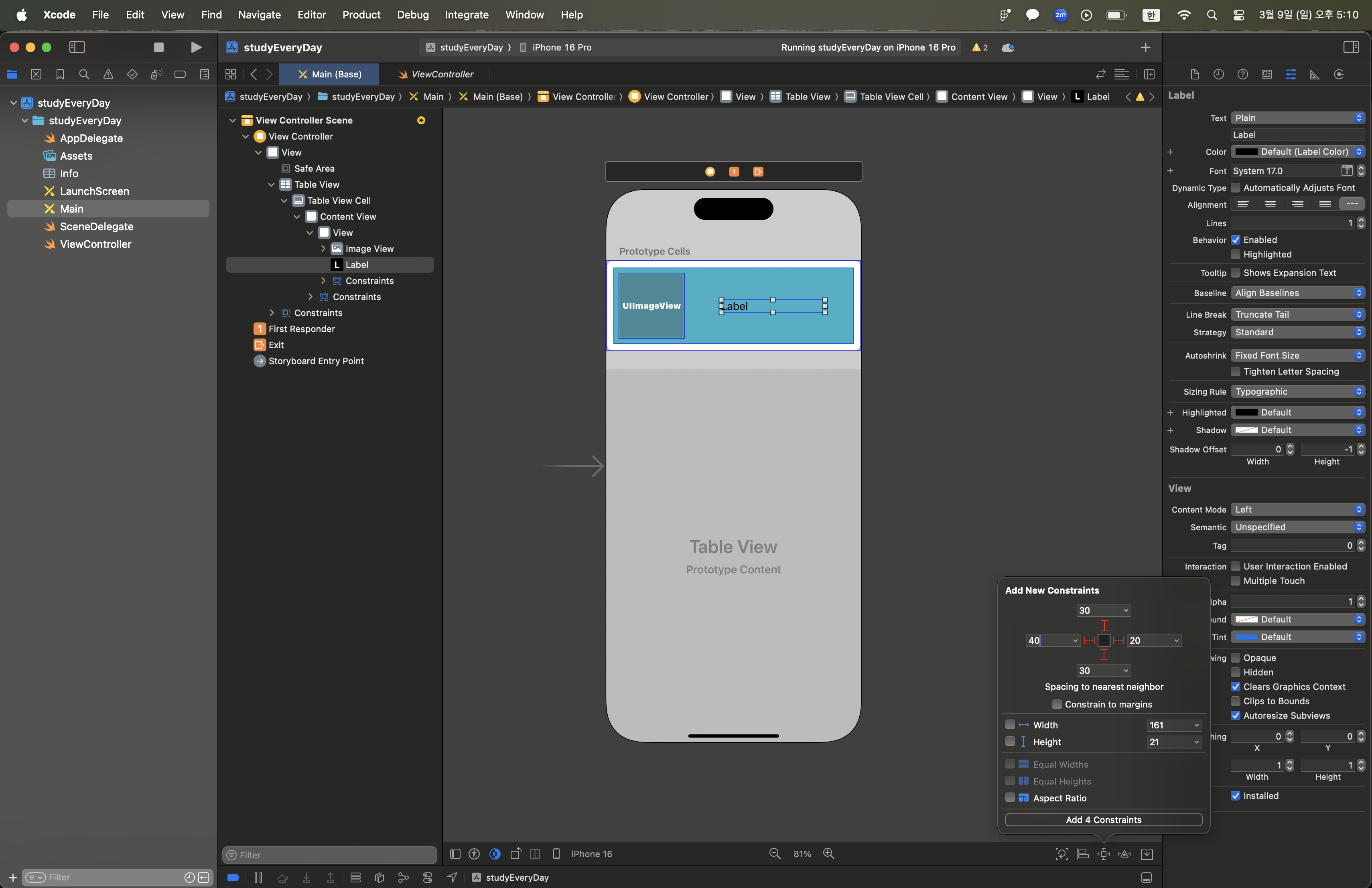 화면 맨 하단부터 TableView > Table View Cell > UI View(배경) > ImageView, Label 순으로 쌓이게 된다.