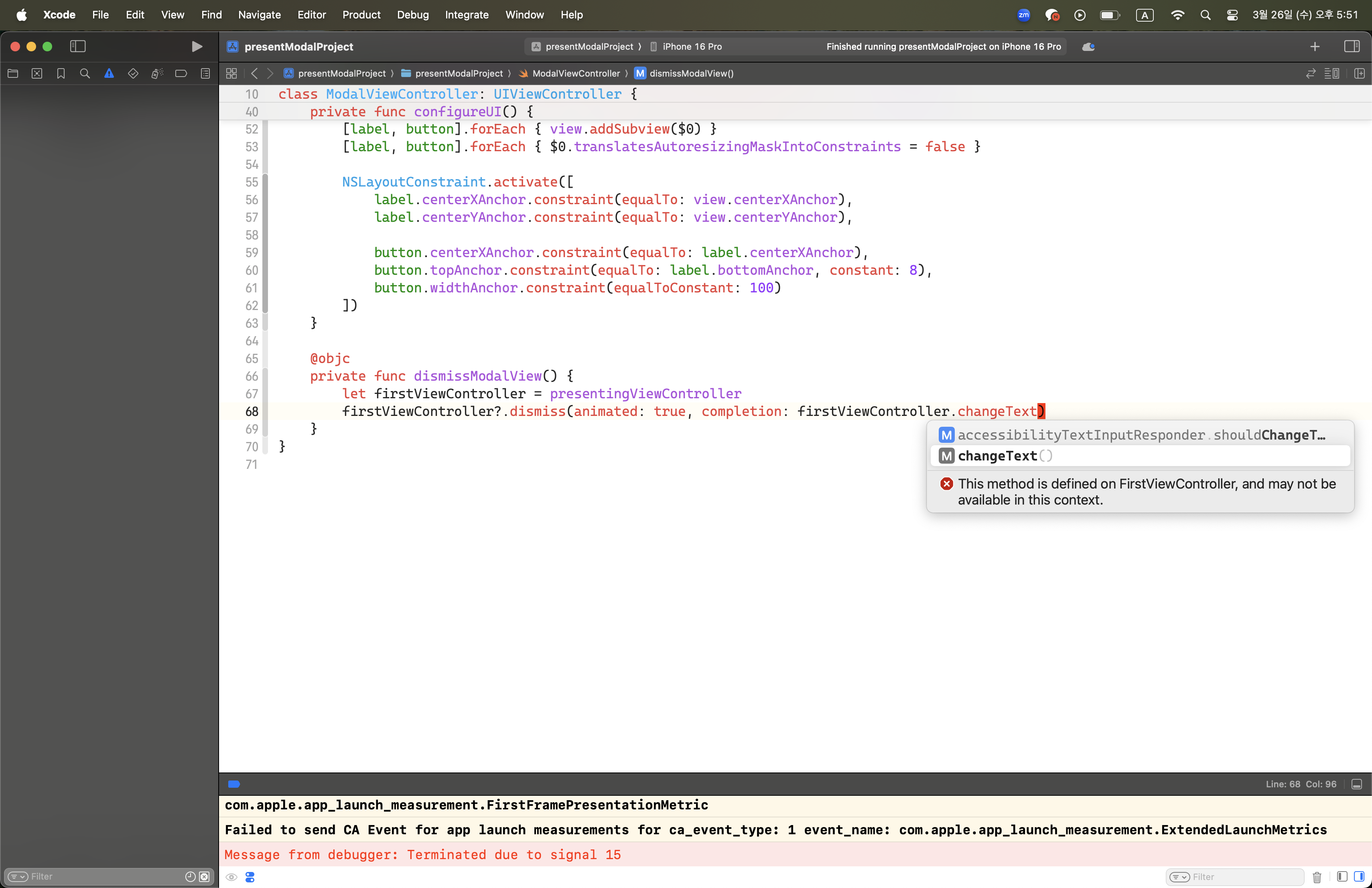 firstViewController.dismiss(animated: true, completion: firstViewController.changeText)