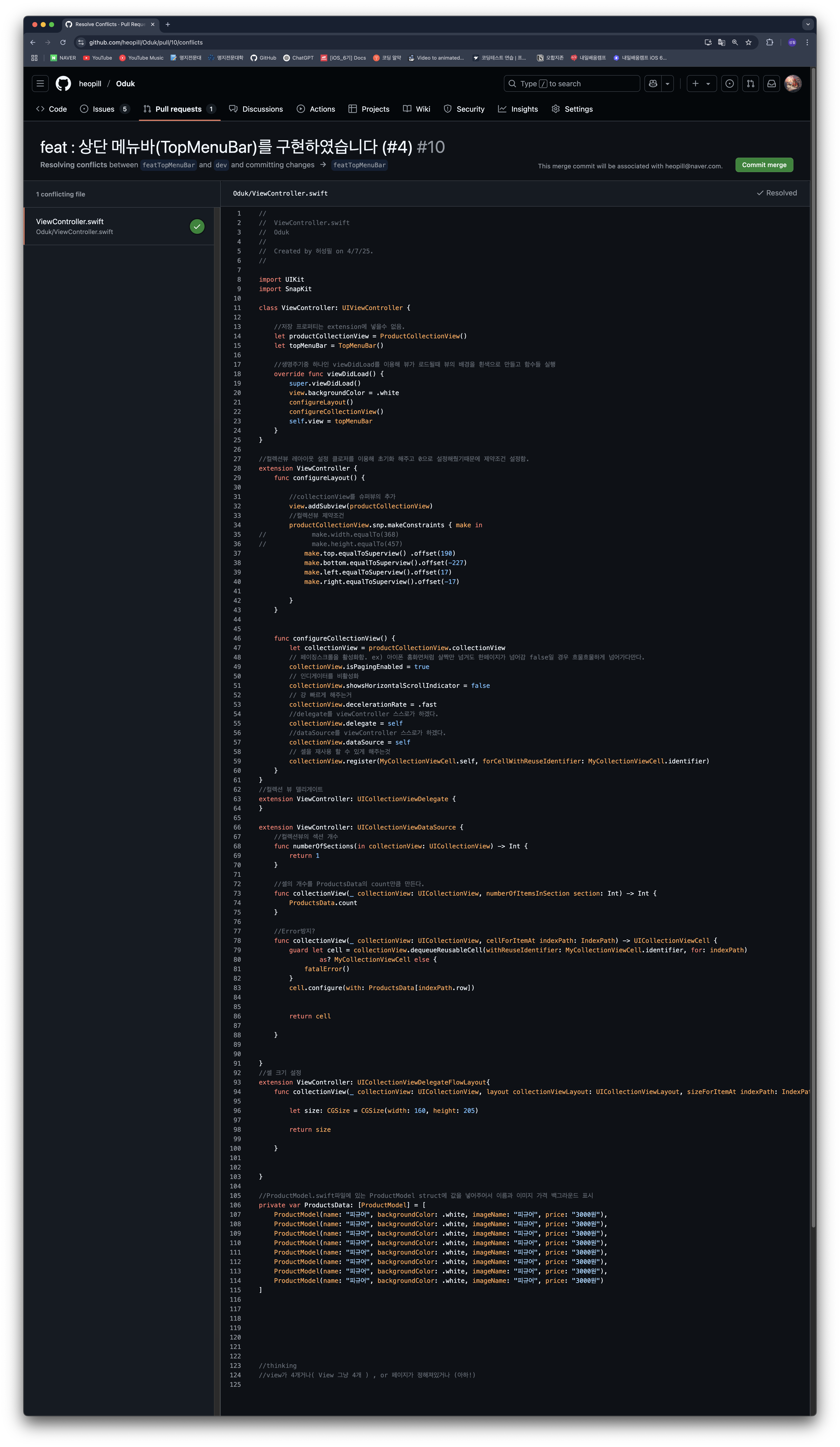 다시 ViewController를 포함해서 커밋을 하고 Merge를 시도했더니 역시 Conflict가 났다.