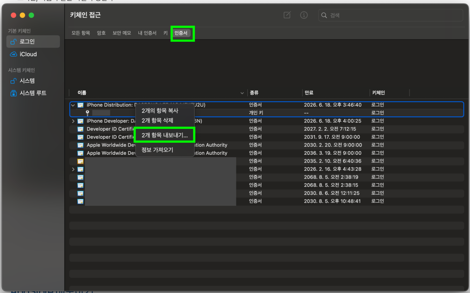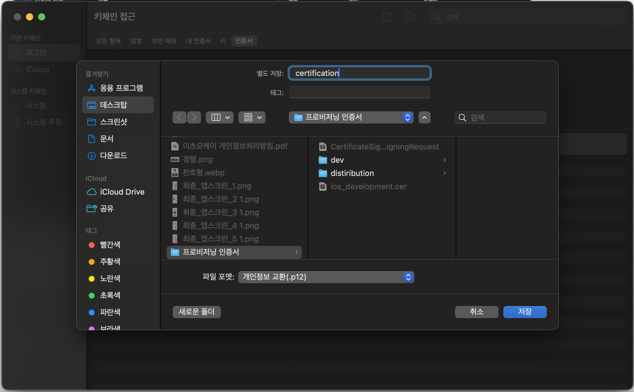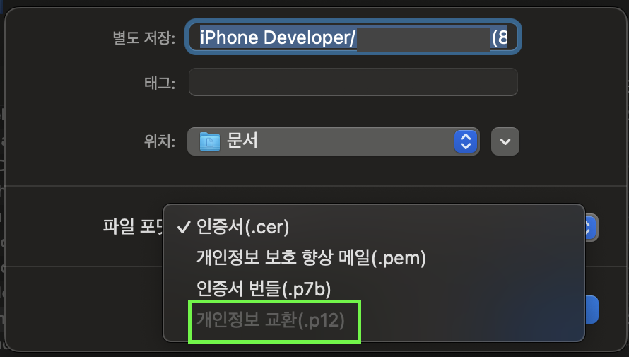 토글을 열고 두 파일 모두 선택한 뒤, 내보내기를 누르고 파일 포맷을 .p12로 하면 된다
