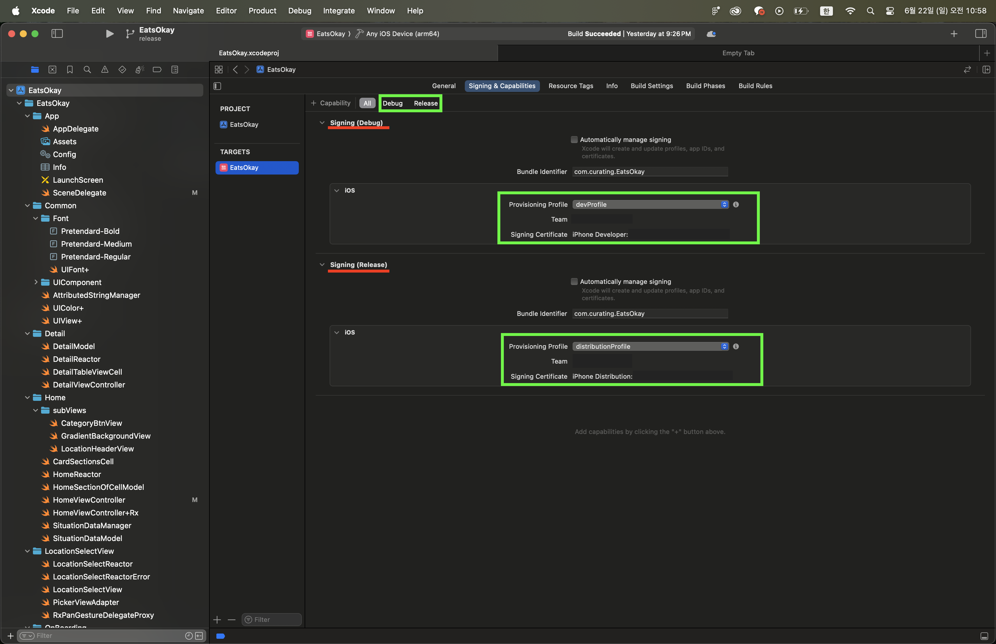 개발할 때 사용할 인증서 / 배포할 때 사용할 인증서 각각 해당하는 항목에 맞게 선택해준다