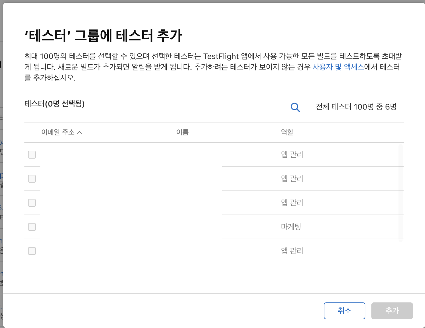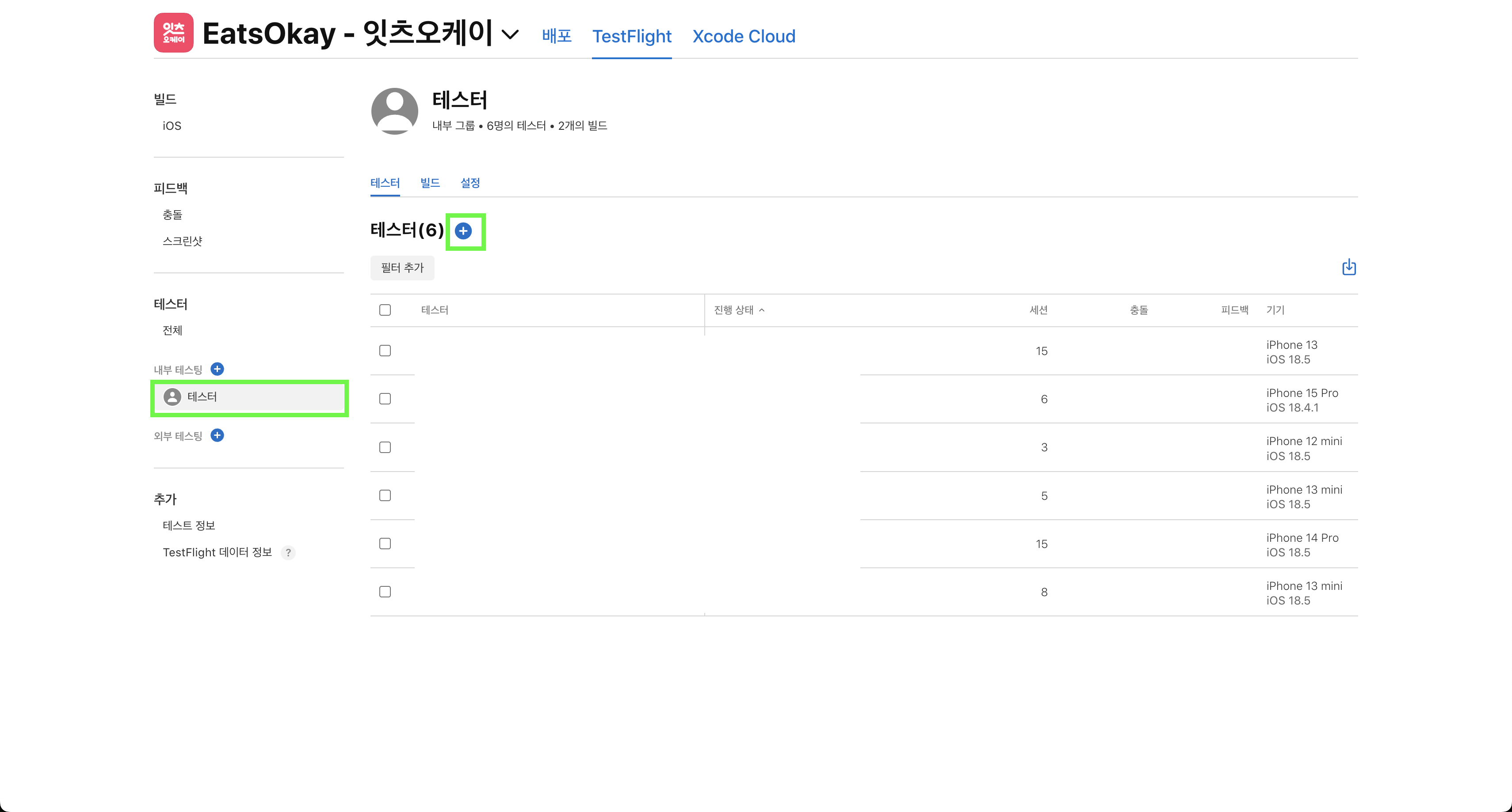 TestFlight에서 테스터 그룹을 추가해준다