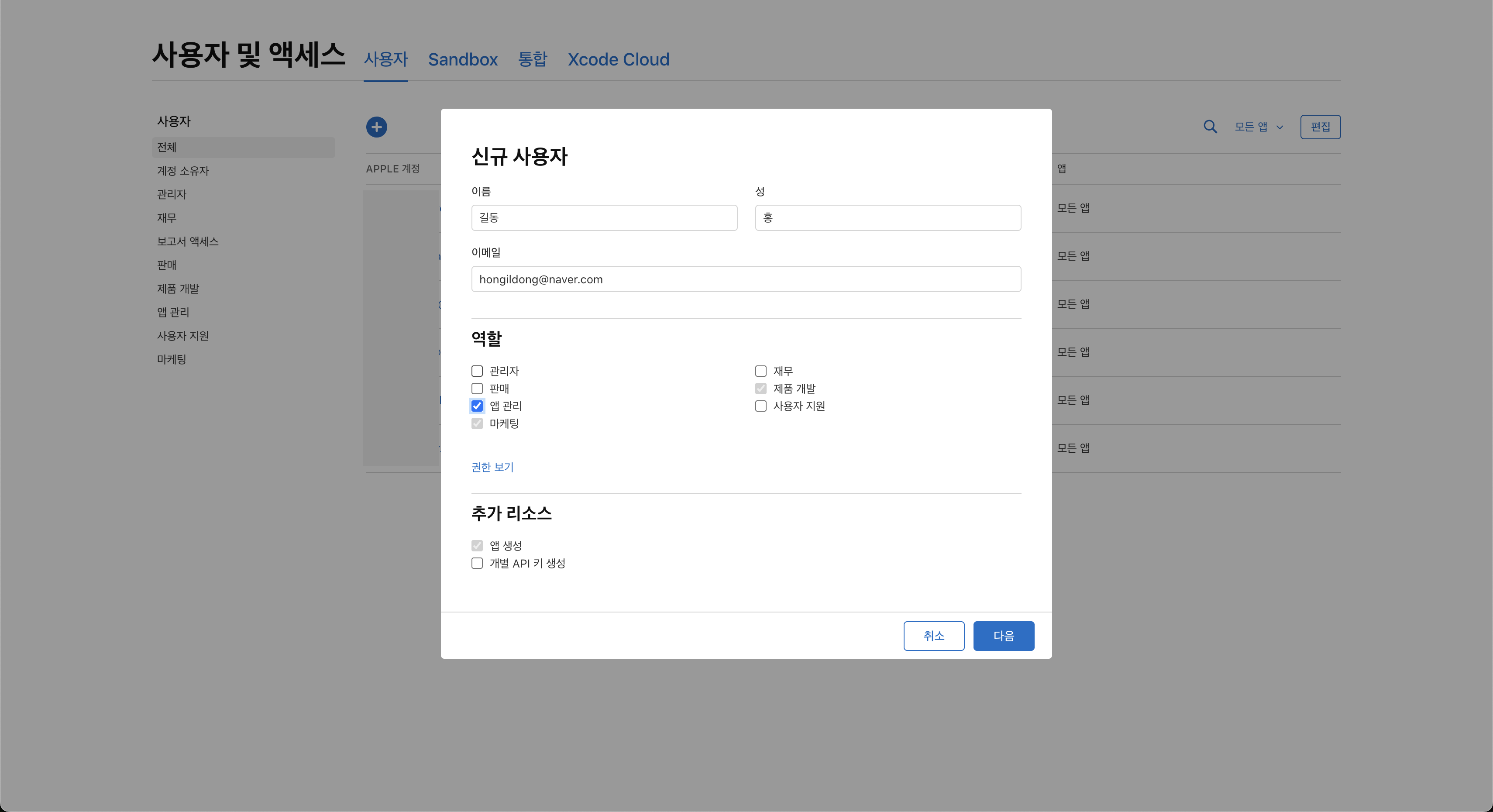 팀원들이 메일로 들어가 초대를 받으면, 앱 관리 또는 마케팅 등 각자의 역할이 추가된다