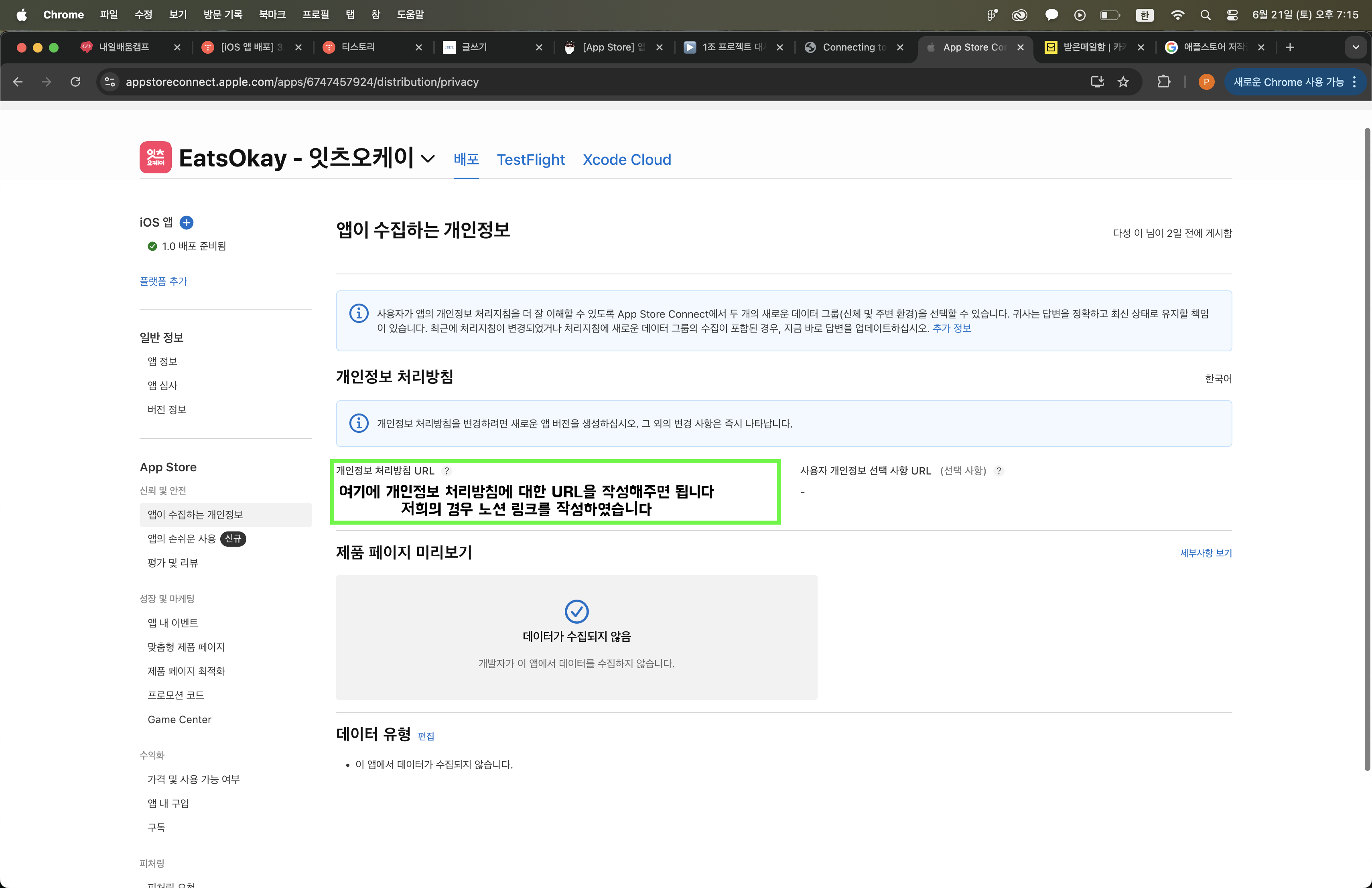 ⎮ AppStore Connect : 앱이 수집하는 개인정보 작성하기