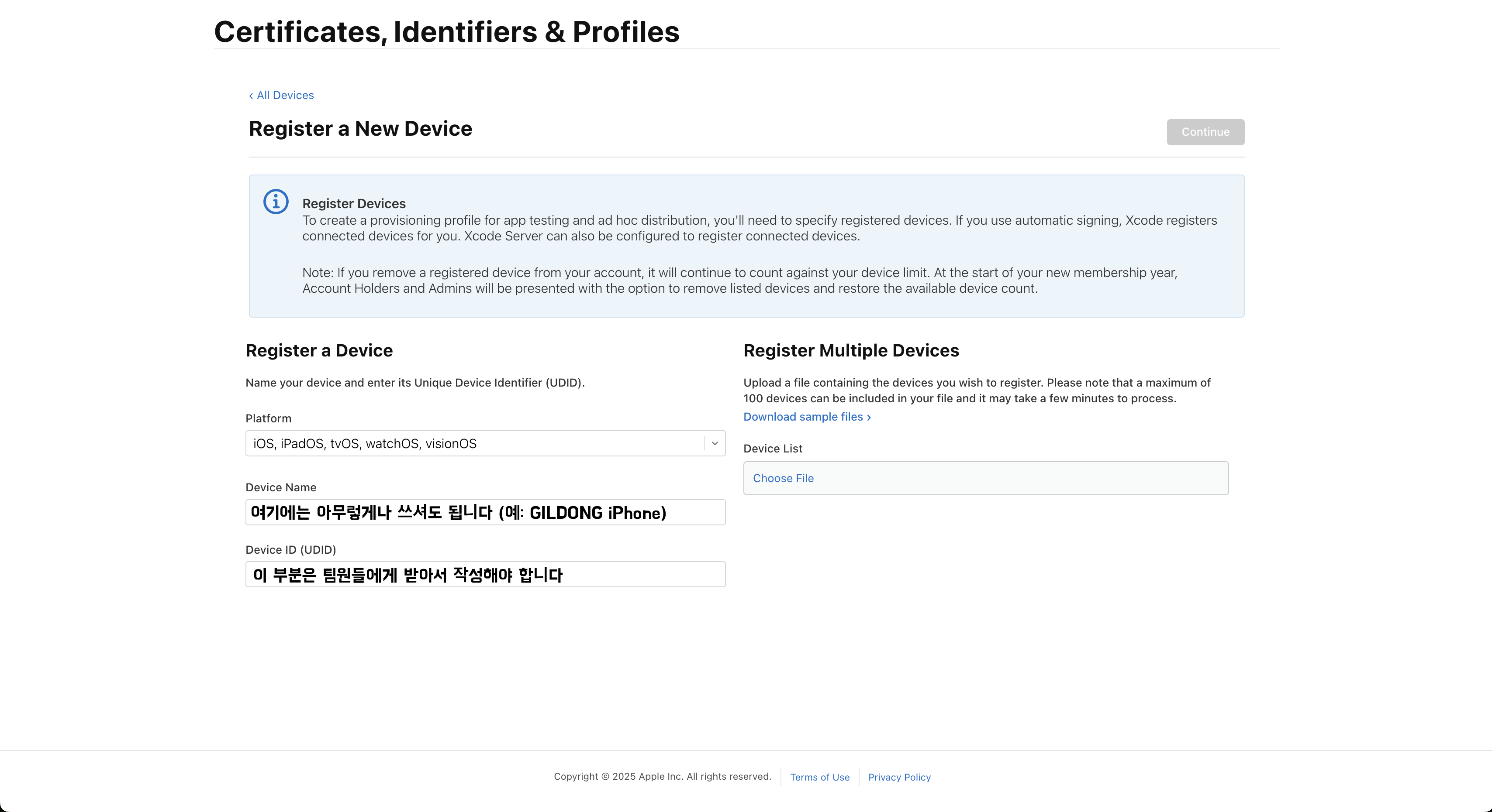 다시 홈페이지로 넘어가서 UUID와 함께 필요한 정보를 입력해주면, 다음과 같이 팀원들의 Devices를 등록할 수 있다