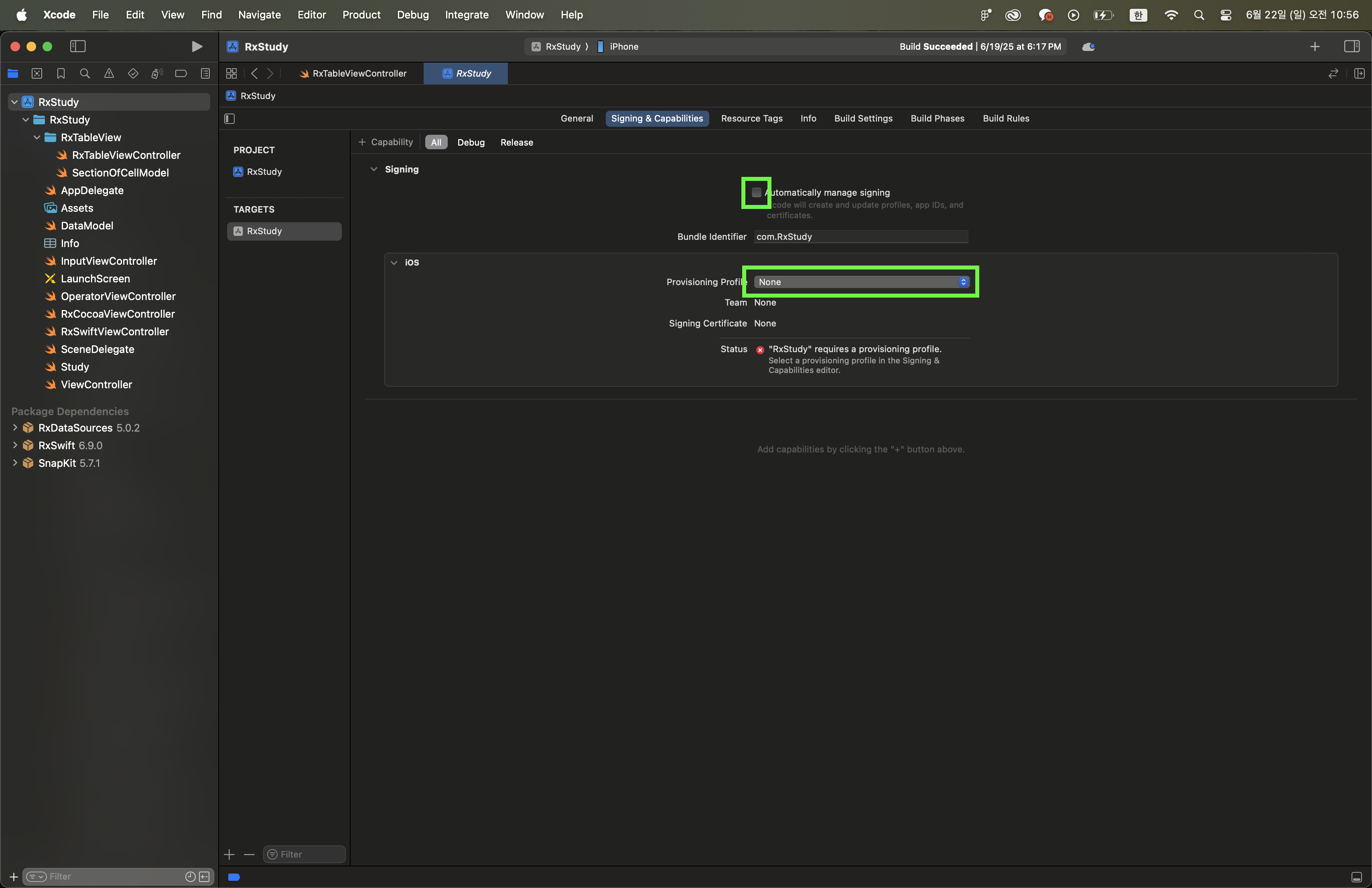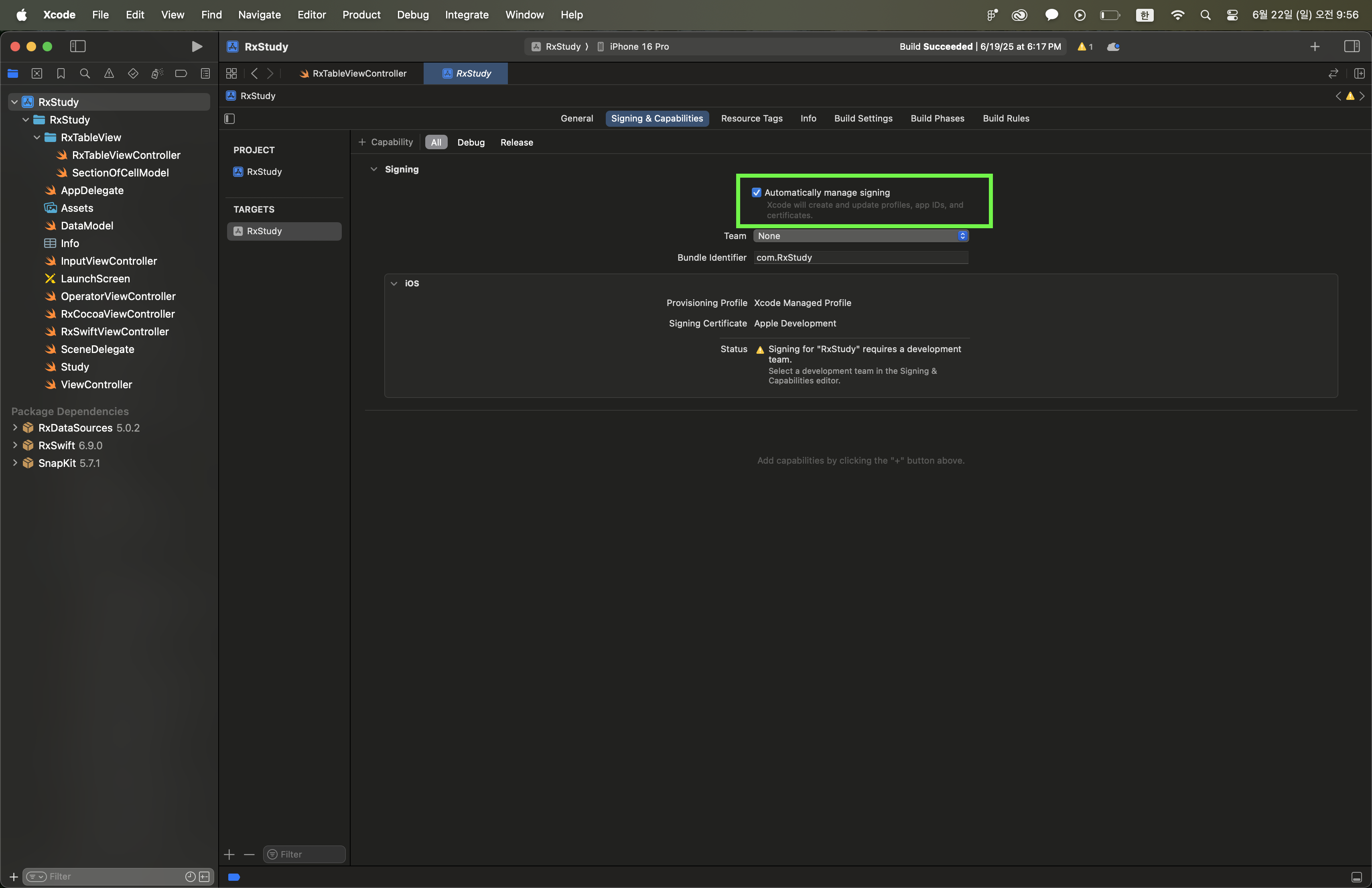 혼자 프로젝트를 진행할 때는 Automatically manage signing이 켜져 있어 문제가 되지 않는다