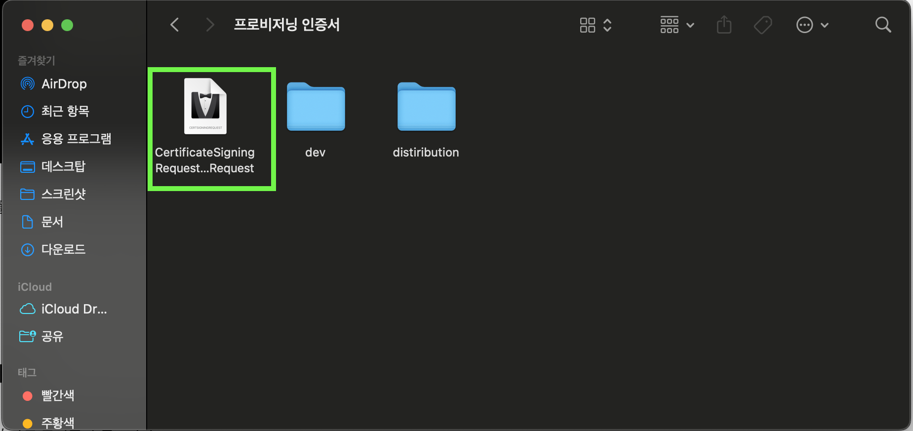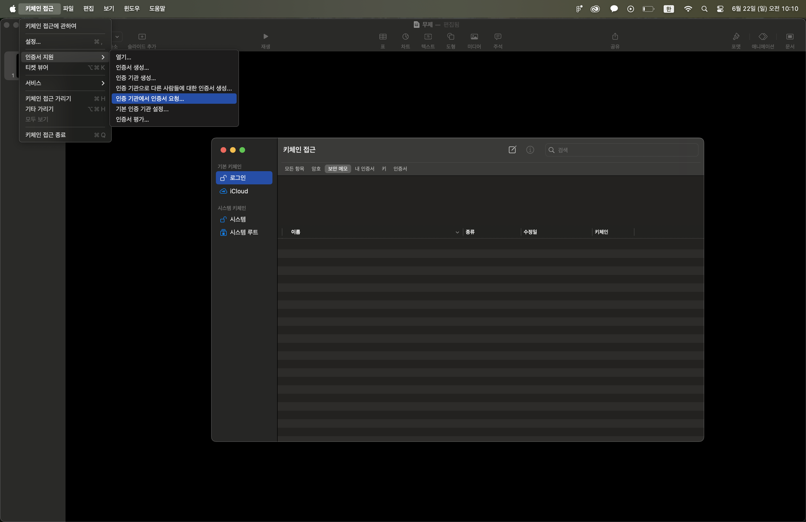 상단 키체인 접근 - 인증서 지원 - 인증 기관에서 인증서 요청을 눌러준다