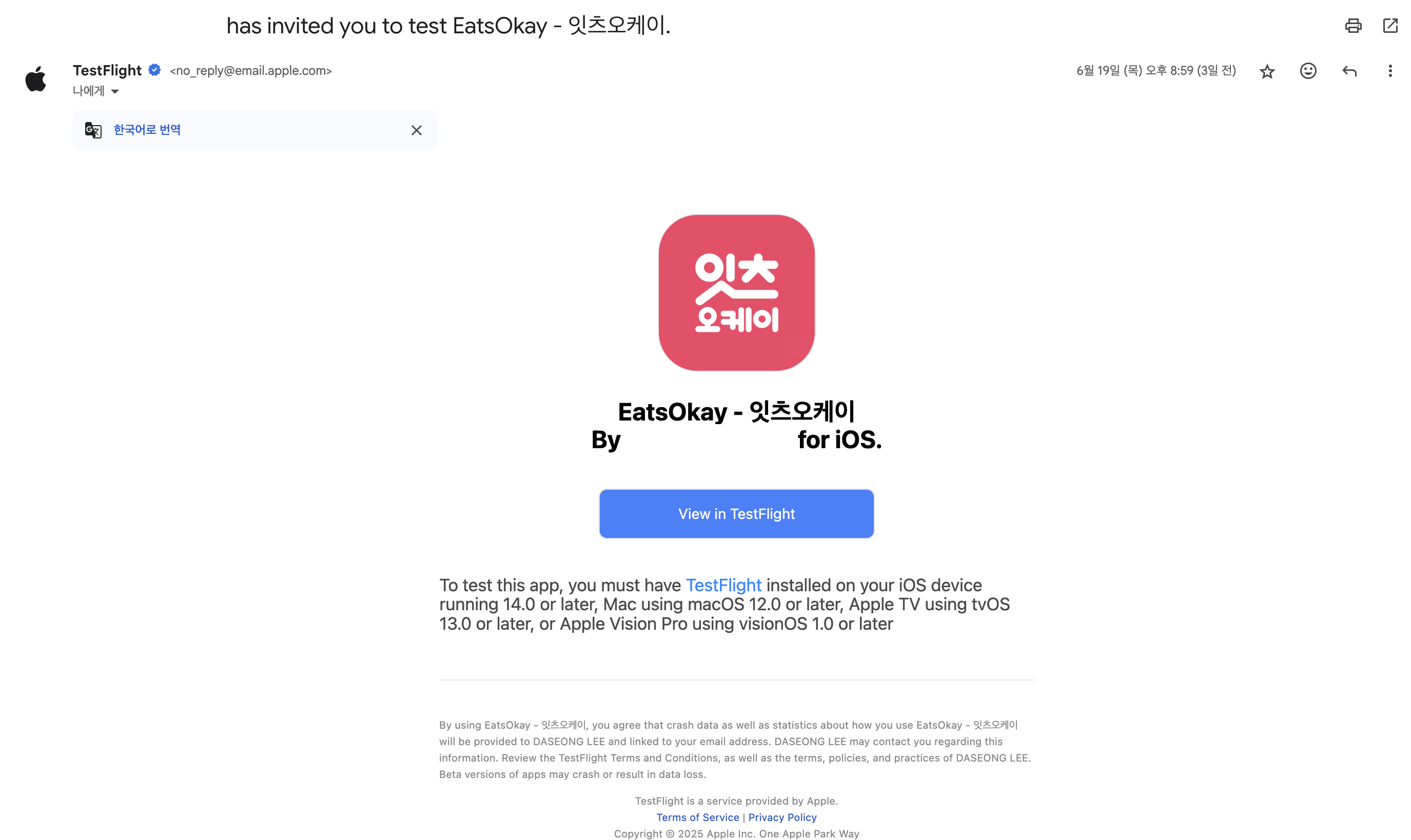 다음과 같은 초대 이메일을 받아 TestFlight를 통해 앱을 다운로드 받을 수 있다