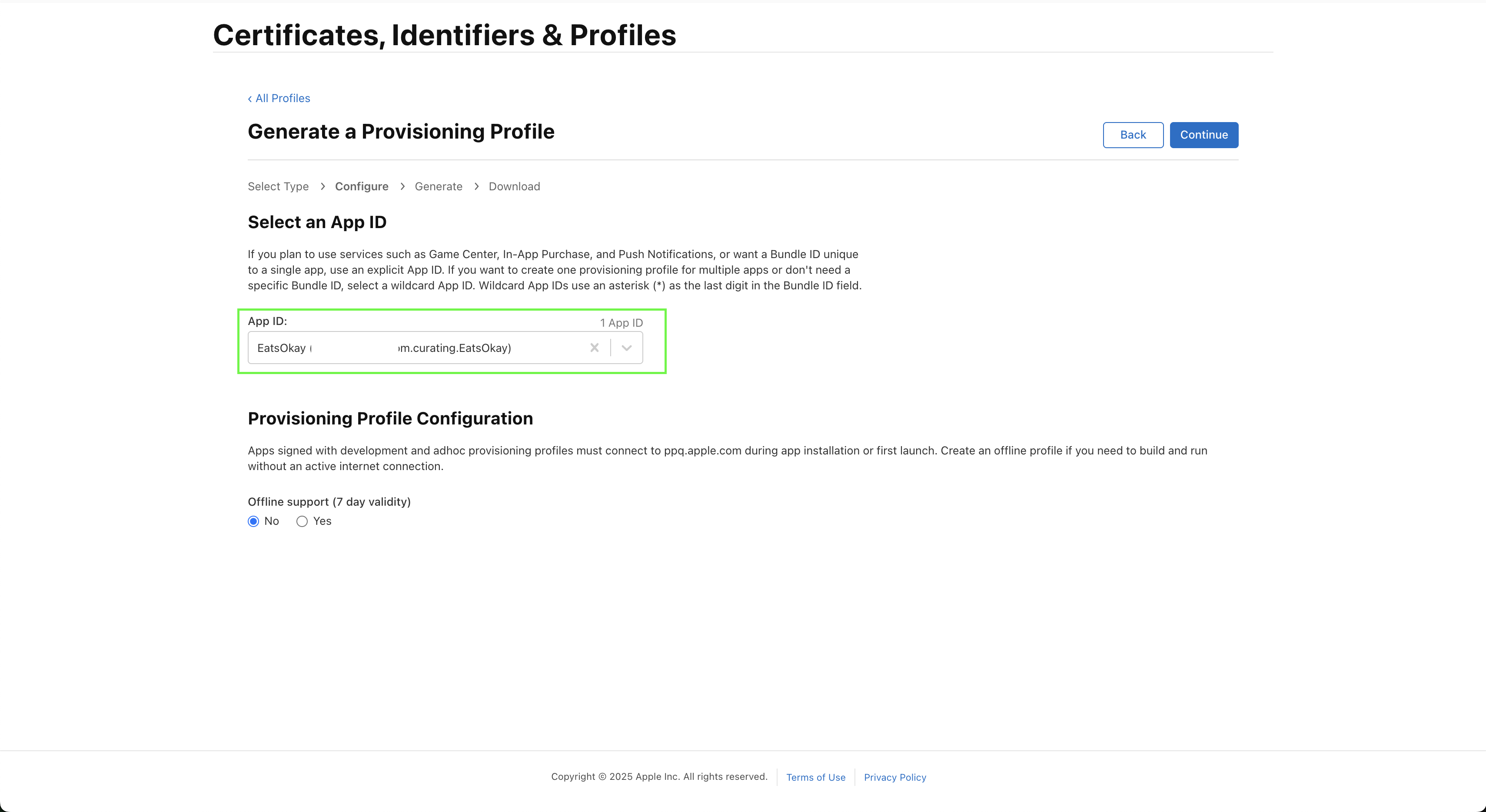 그러면 App ID를 선택하고, Continue를 누르면 된다