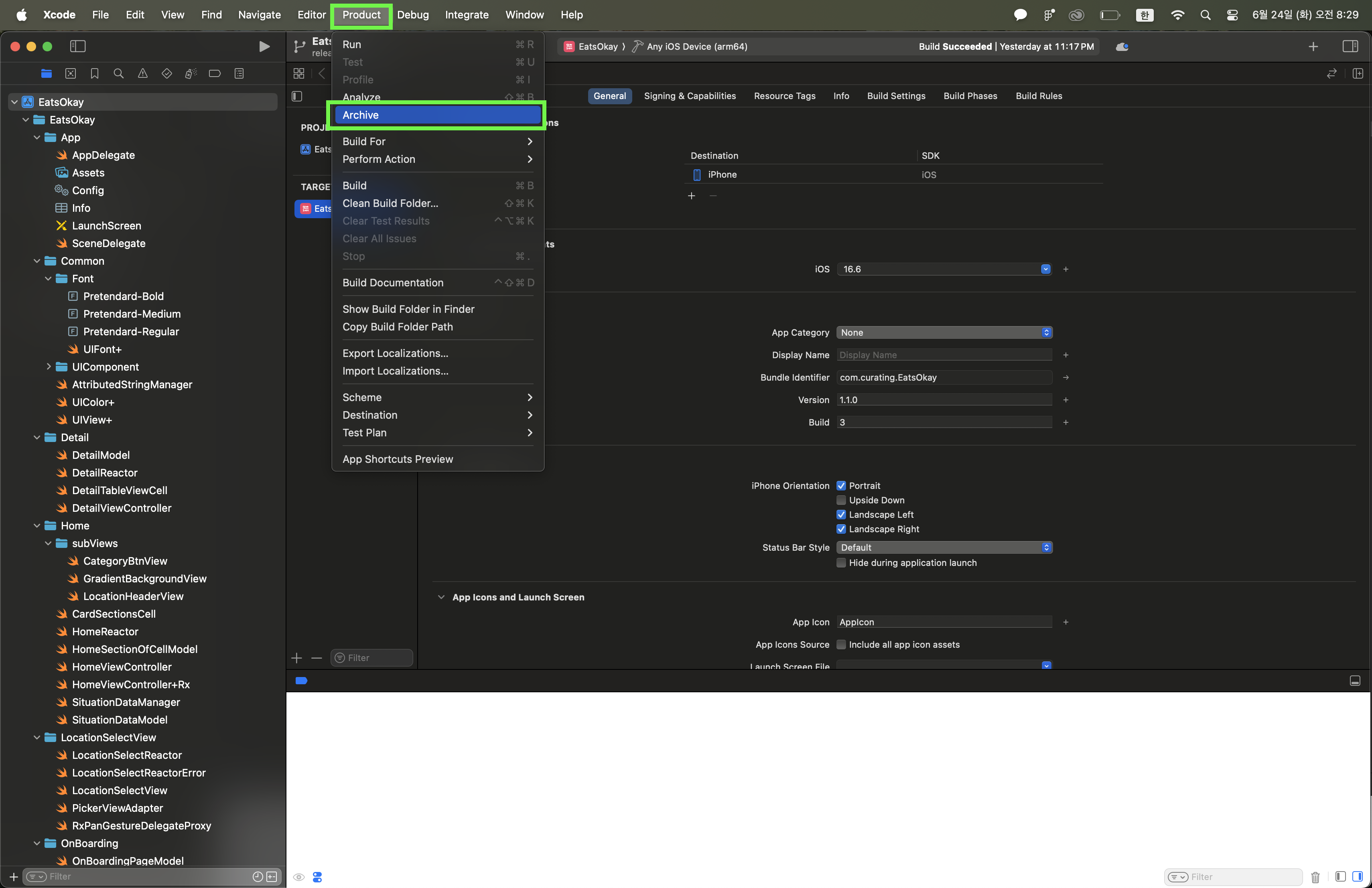 위처럼 Version과 빌드 숫자를 변경해주었으면 배포 때와 동일하게 Archive를 하면 된다