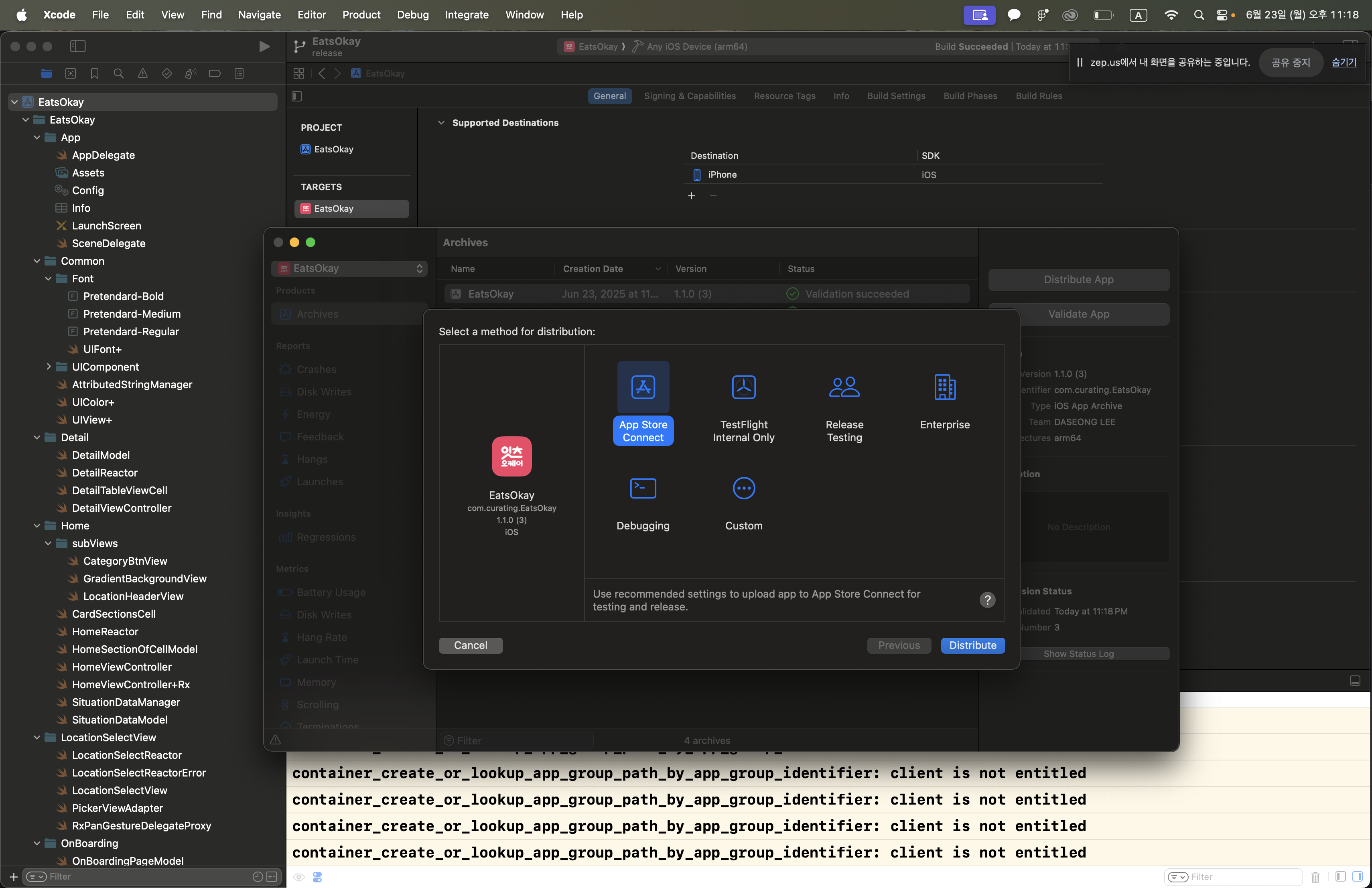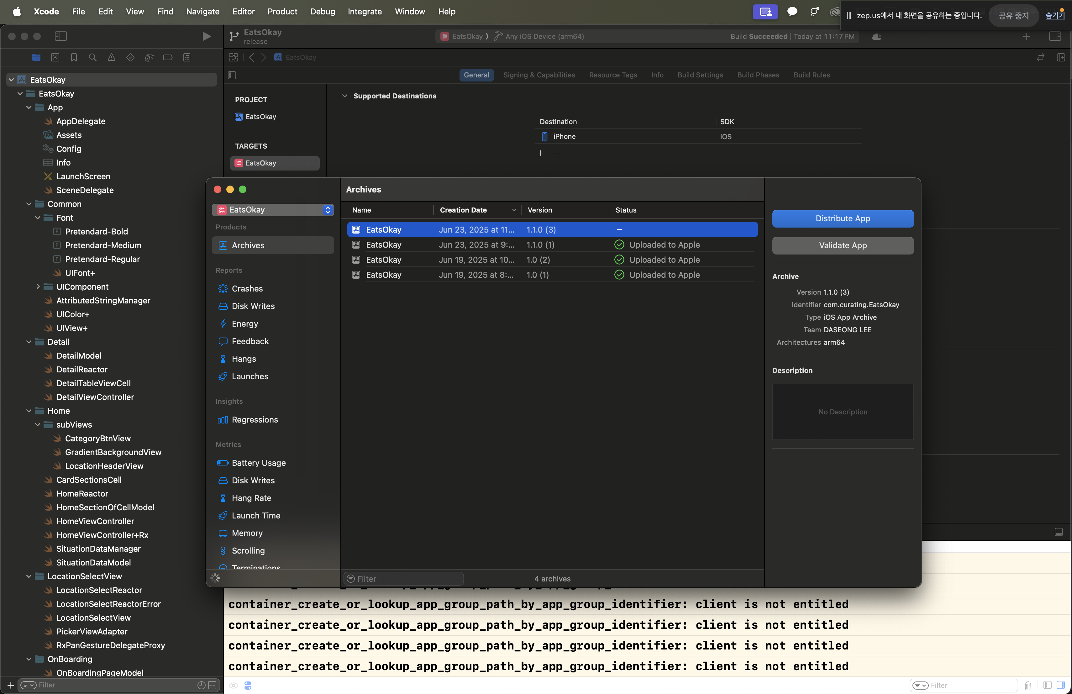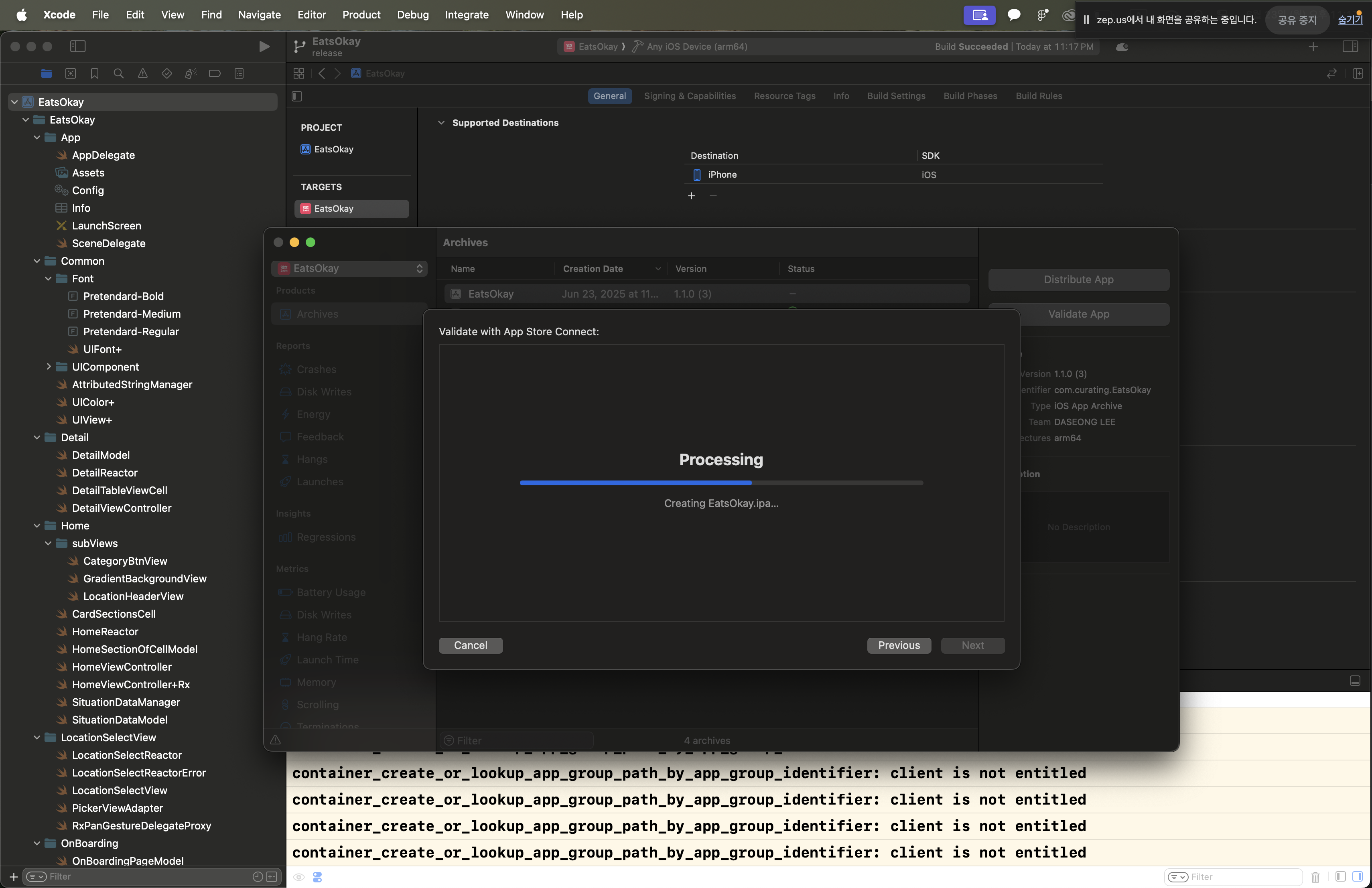 마찬가지로 다음의 절차들을 완료하고 Done을 누르면 AppStore Connect에서 해당 빌드를 확인할 수 있다