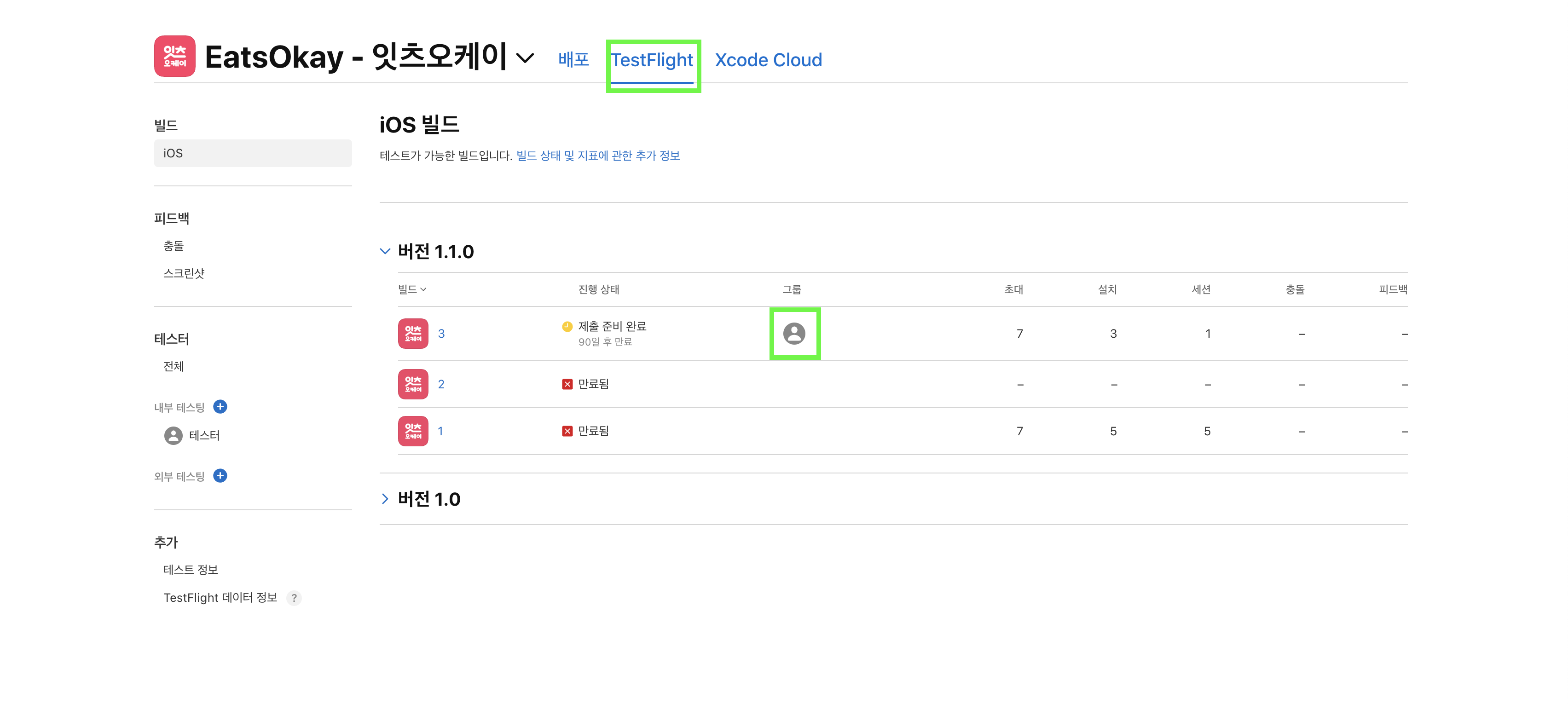 위 사이트에서 앱을 누르고 들어가서 TestFlight로 들어가면 된다