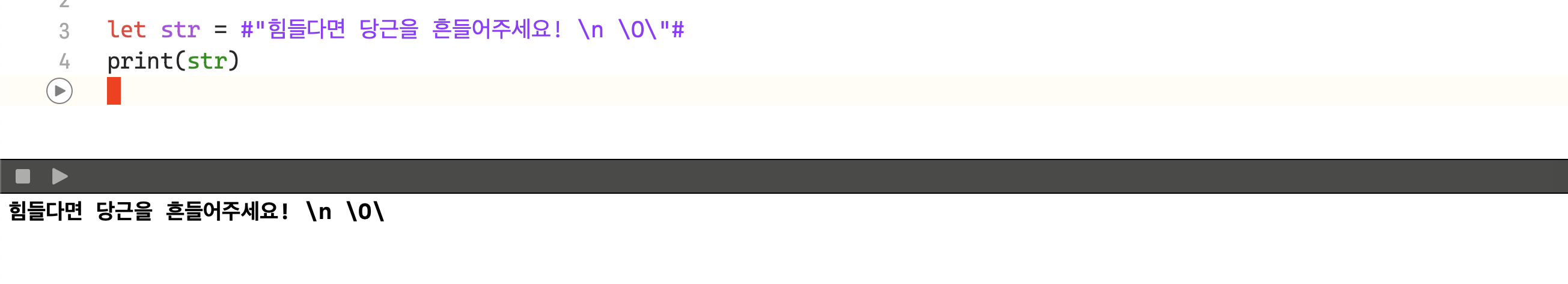 let str = #"힘들다면 당근을 흔들어주세요! \#n \O\"#