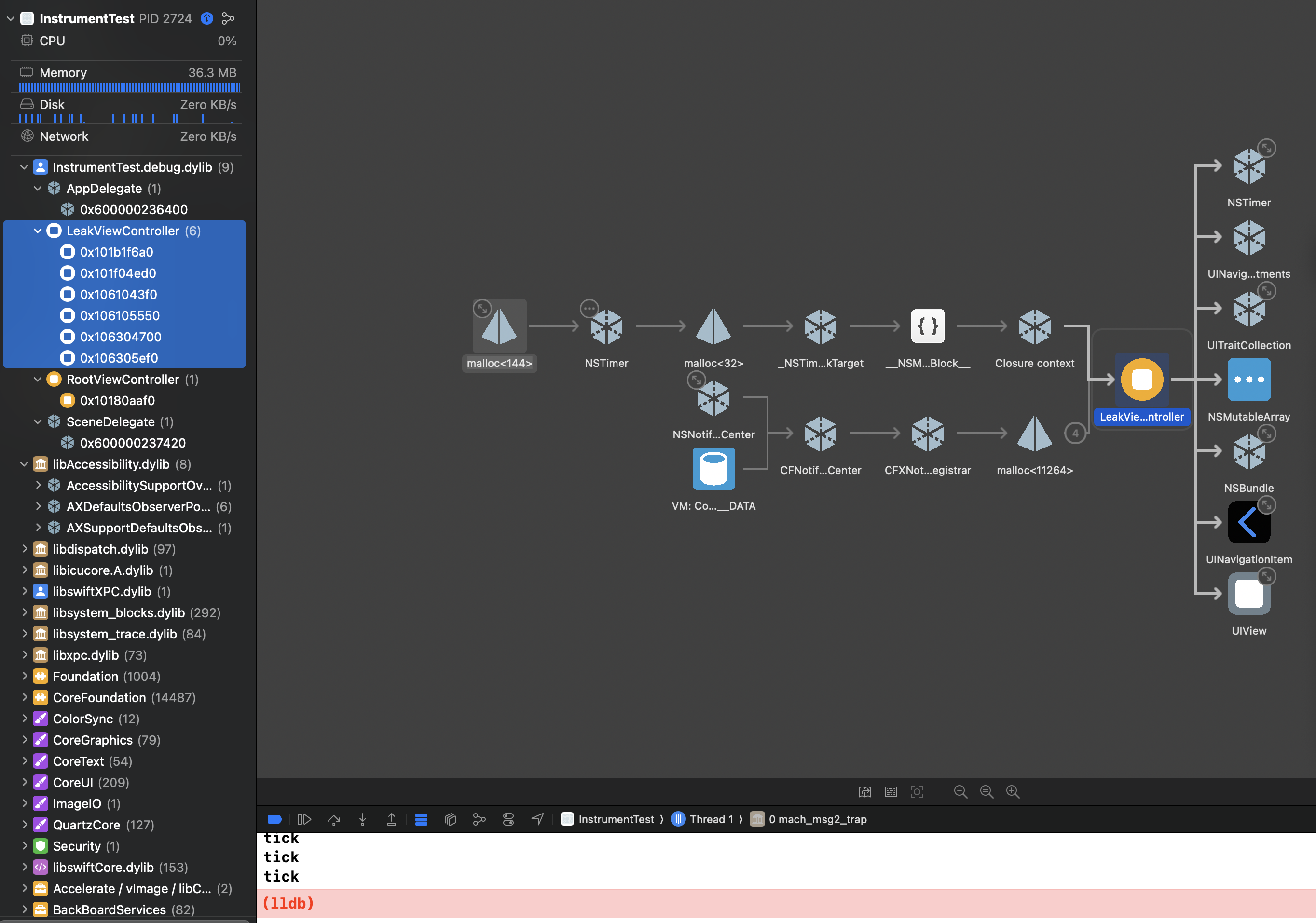 정상적인 상황이라면 좌측 dylib에는 LeakViewController 객체가 없어야합니다