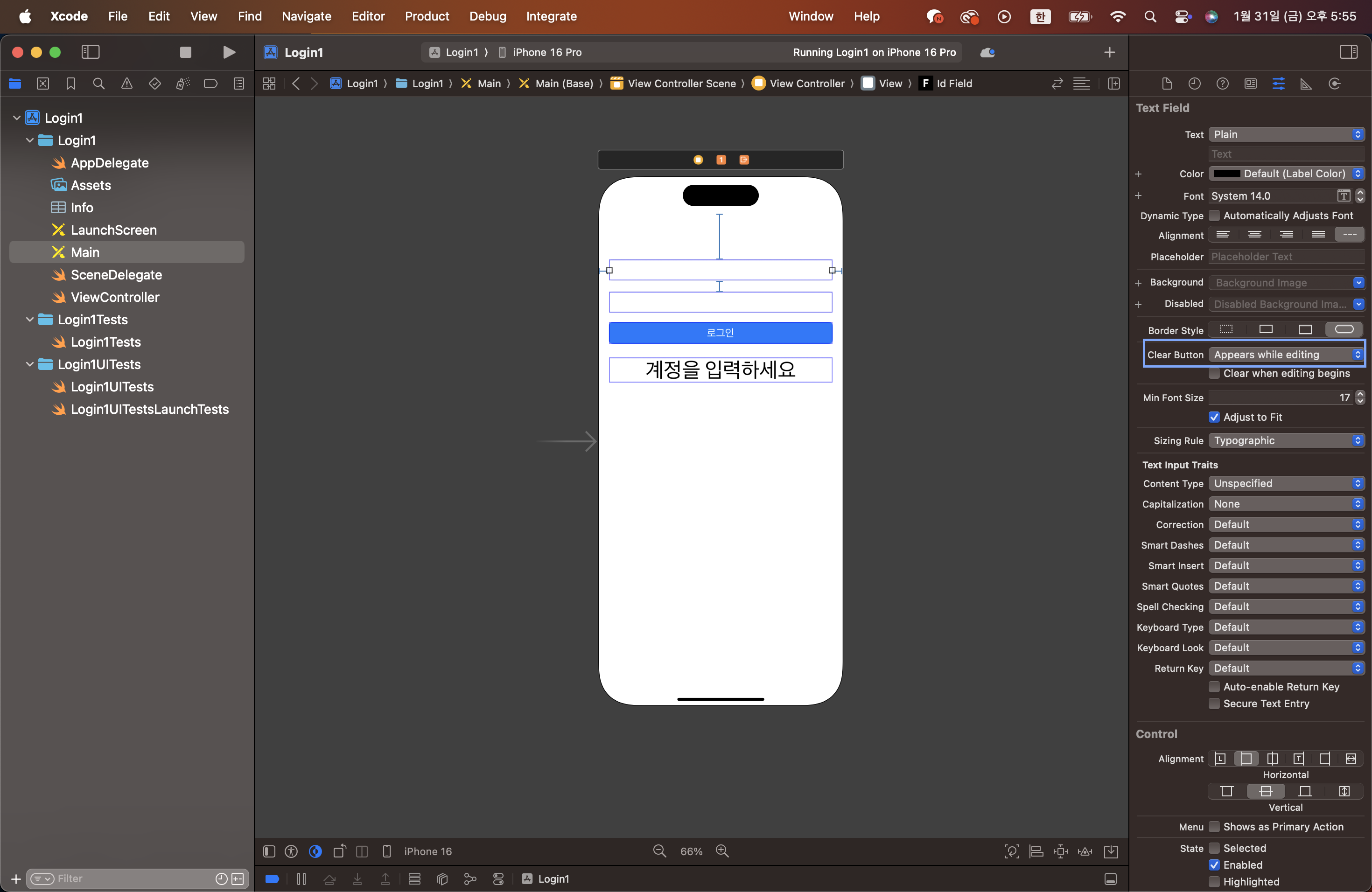 1. Text Label 선택 후 inspector 창에서 Clear Button 추가