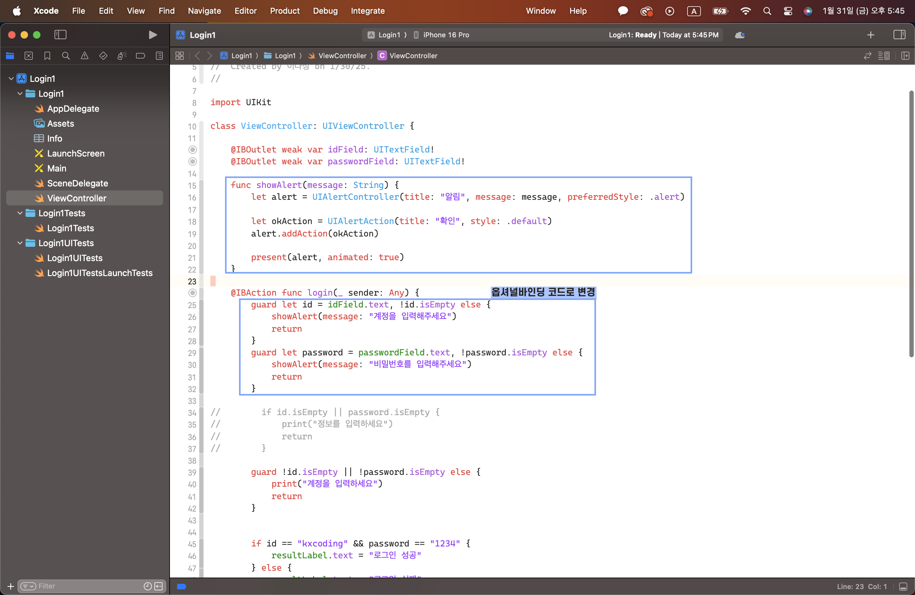 1. 알림창을 나타내는 함수 추가, 옵셔널 바인딩으로 코드 변경
