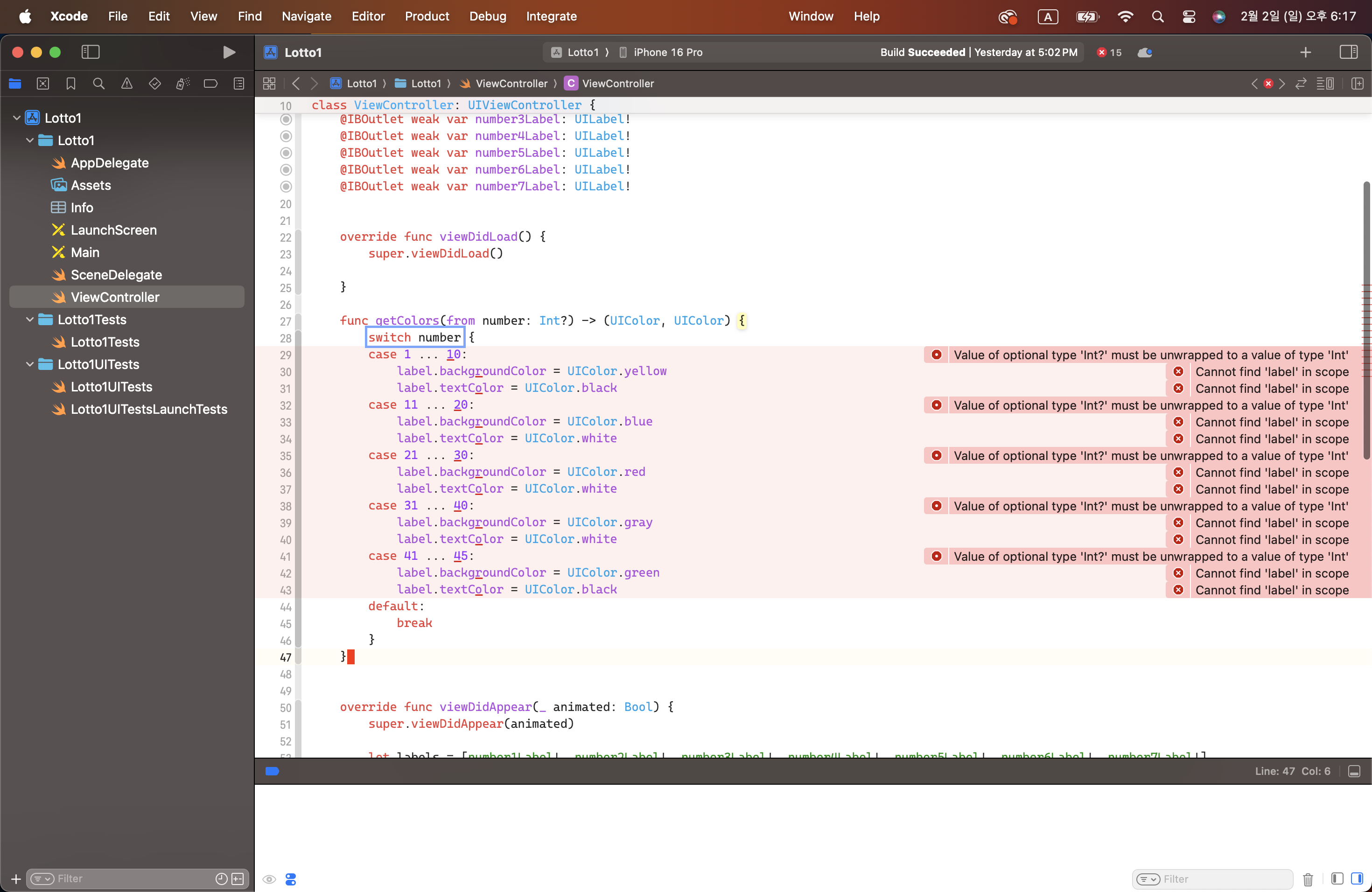 3. 파라미터(sortedNums[index])를 number로 바꾸기 * 값을 비교하려면 Int?는 반드시 unwrapping을 해야함