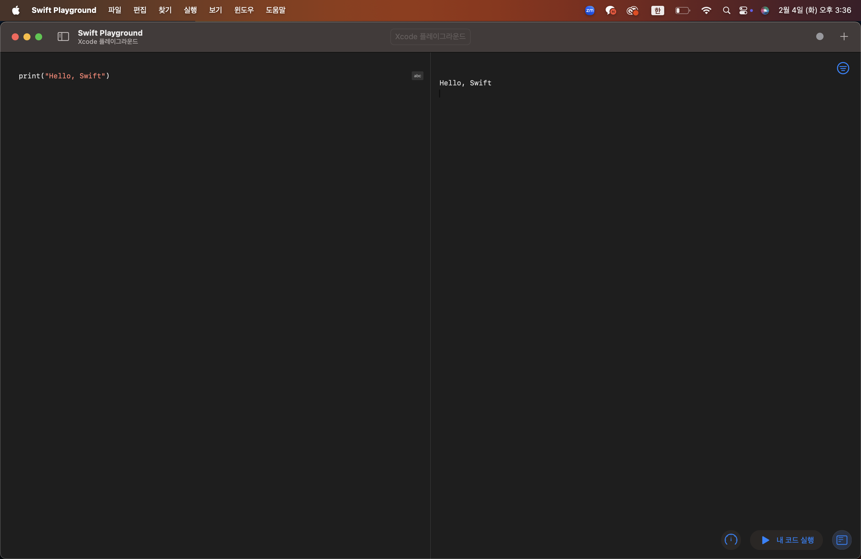 이렇게해서 Xcode 플레이 그라운드 안에서 실행하니 오류가 없이 코드를 실행할 수 있었다.