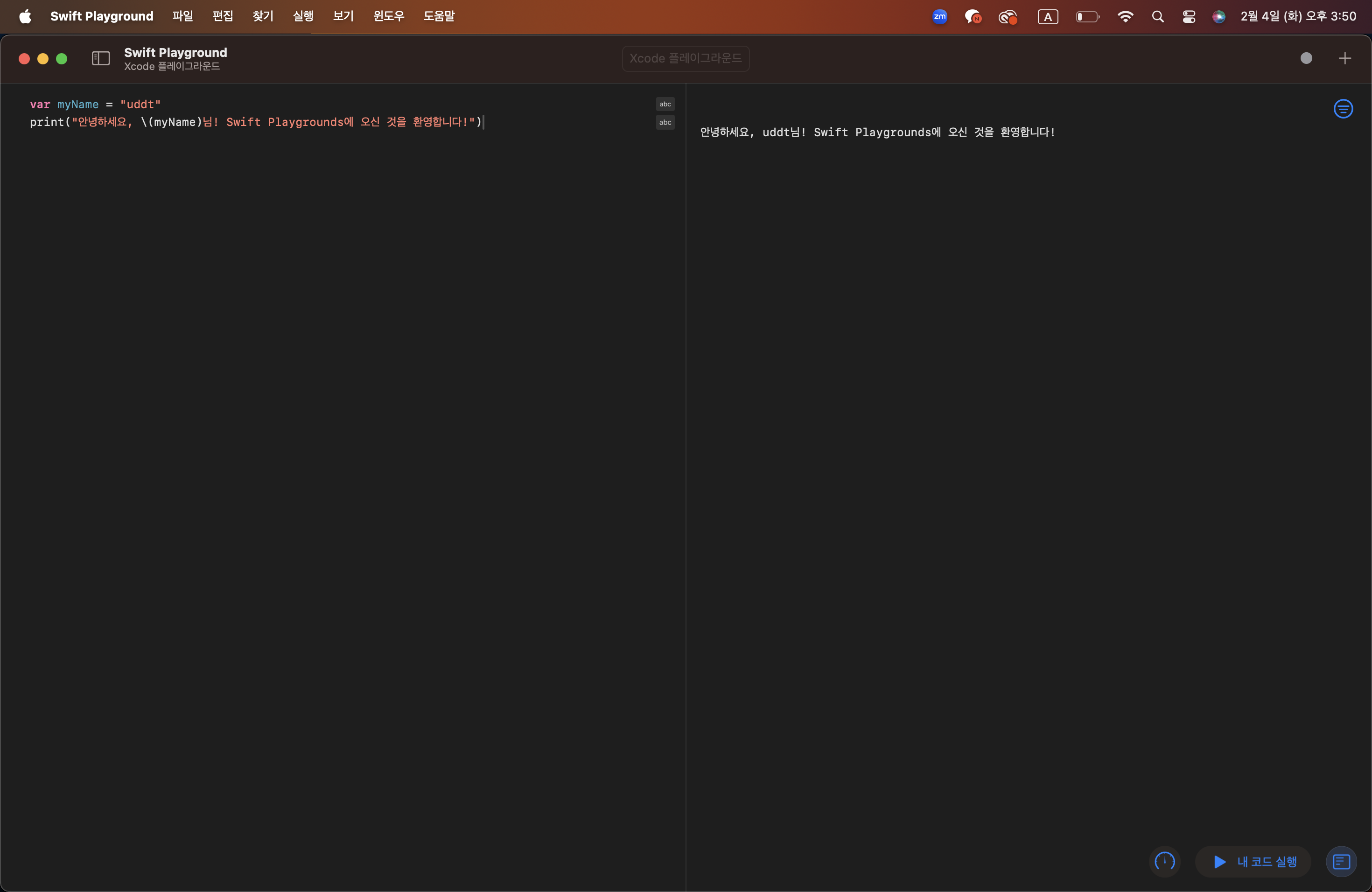 // 안녕하세요, uddt님! Swift Playgrounds에 오신 것을 환영합니다!
