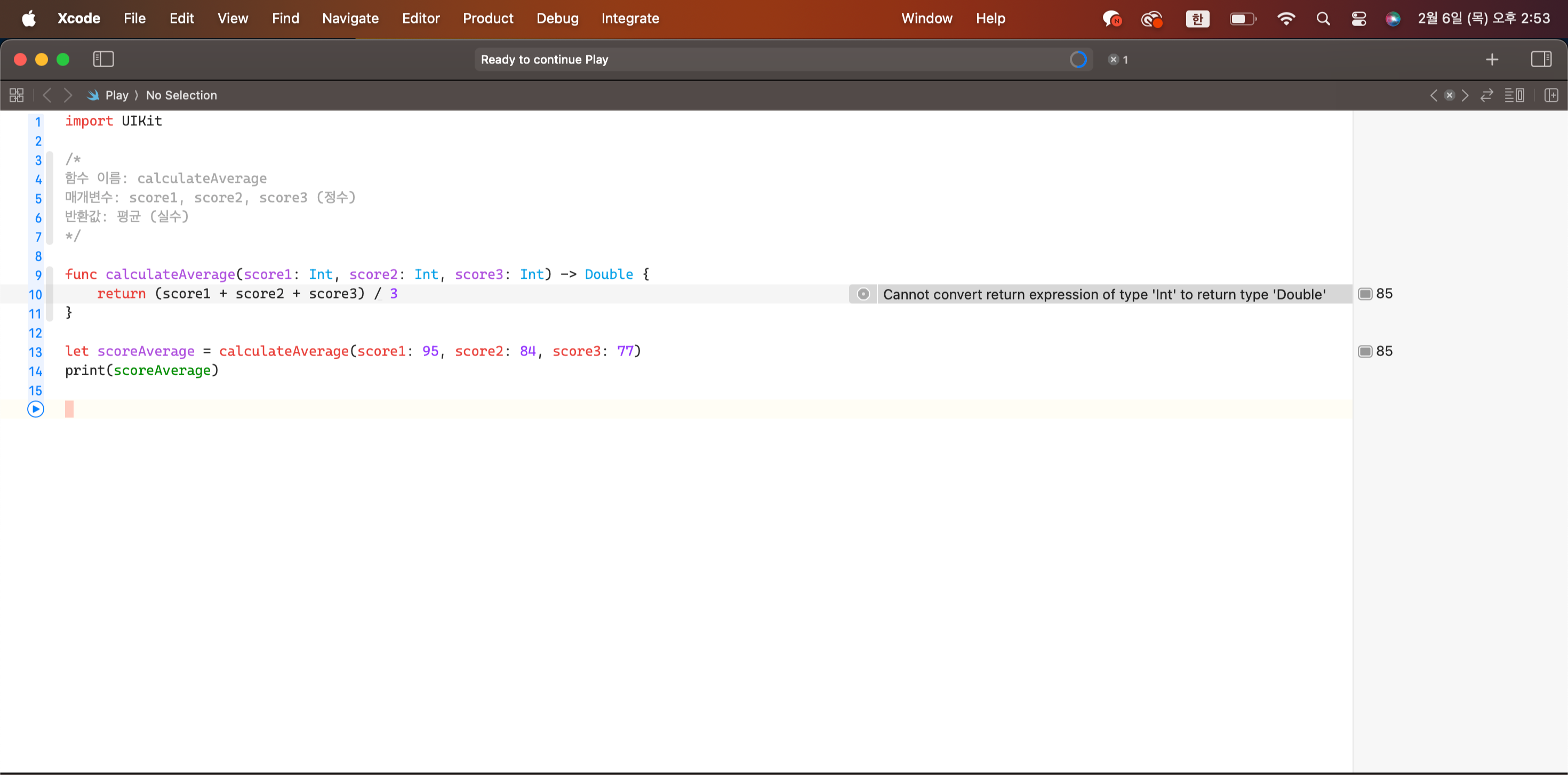 따라서 함수에서 작성한 것처럼 Double이 나올 수 없어 에러가 발생한 것이다.